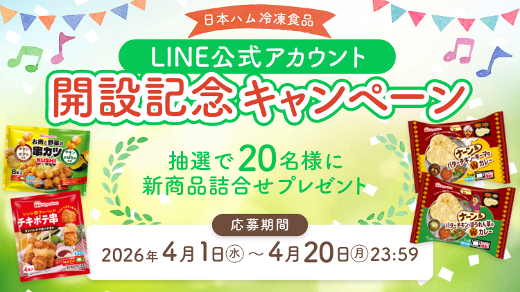 抽選で20名様に日本ハム冷凍食品の新商品詰め合わせプレゼント (ナーン&バターチキン・キーマのWカレー、ナーン&バターチキン・ほうれん草のWカレー、お肉と野菜の串カツ、チキポテ串)