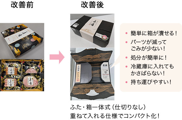 化粧箱のパーツを減らす(中仕切りと底箱(ブロック箱)の削減)+箱材のコンパクト化を行い、商品を重ねて入れることで、紙の使用量を約40%削減しました。※22年度歳暮時化粧箱比