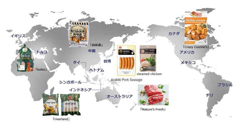 1977年に米国で開始した海外事業。今では15の国・地域の64拠点で展開しております。世界の多様なニーズにお応えするために、牛や鶏の生産・飼育・処理・加工・販売、ハム・ソーセージや加工食品の製造・販売のほか、水産品やエキス調味料、野菜など幅広い商品を取り扱っています。