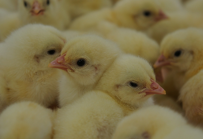 各農場では、徹底した防疫体制を整えています。また、衛生環境を保つために、ヒナを一斉に鶏舎に入れ、一斉に出荷する“オールイン・オールアウト方式”を採用し、出荷後は、鶏舎を徹底的に洗浄・消毒しています。