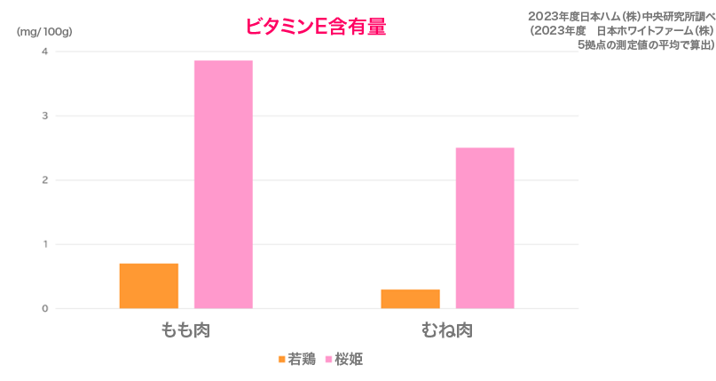 桜姫の飼料は工夫することによって、一般の鶏肉と比べてビタミンEが3倍以上含まれることが確認されています。※