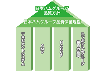HACCPや「経営者又はトップの責任」「開発設計・審査」などのFSM(食品安全マネジメント)、「生産工程管理」などのGMP(適正製造規範)の3つの柱と、ニッポンハムグループ独自の基準をもう一つの柱とし、要求事項を規定しています。