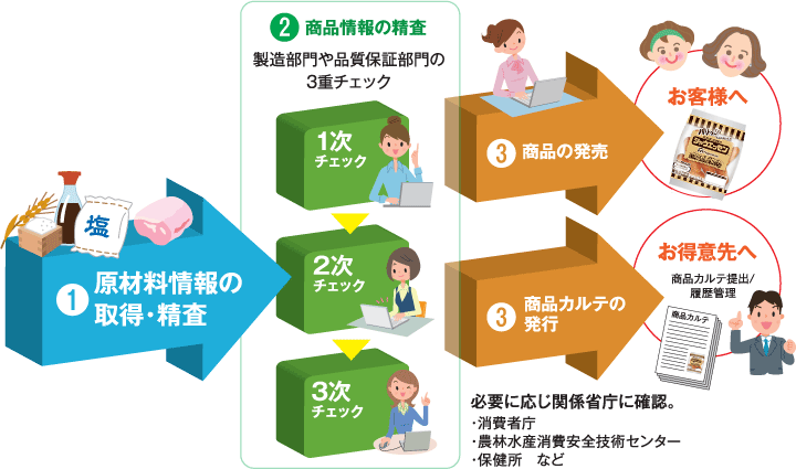 正確な原材料情報の取得と法令に適合した間違いのない商品情報を管理する体制を構築しています。