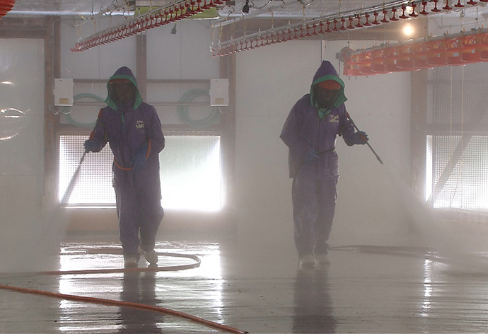 飼育農場では、鶏舎ごとにひな鶏を受け入れ、鶏の出荷までを一斉に行い、鶏舎の洗浄などを行うことで衛生環境を保っています。