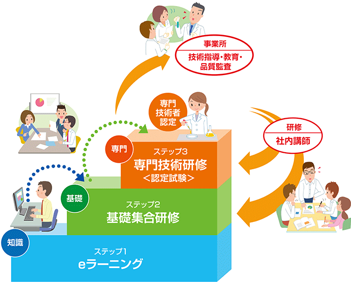 全グループ会社から選抜され、高い技能を修得し最先端を行く技術者の養成を行います。独自の試験制度をクリアした人財は専門技術者として認定されます。第三者または同等の資格者が客観的評価を実施しています。専門家認定者は、事業所の技術指導・教育、基礎研修・専門研修の講師として活動します。