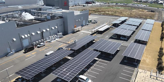 事業所の屋根などを活用し、太陽光発電設備の設置を進めています。2025年3月末現在、全国40カ所で太陽光発電設備が稼働しています。