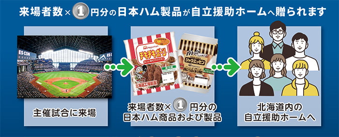 日本ハム(株)とファイターズが共同で取り組む【FOOD COUNTER(フード・カウンター)】は、スタジアムでの試合観戦が自動的に寄付につながる観客動員数連動型社会貢献です。2016年から、主催試合の観客動員数×1円分の日本ハム製品を、道内の自立援助ホームやこども食堂北海道ネットワーク(2020-21)に寄贈しています。