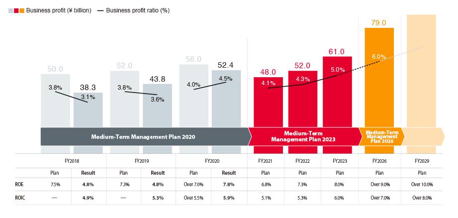 The financial targets for Medium-Term Management Plan 2023, which concludes with fiscal 2023 ending in March 2024, are for net sales of ¥1,220 billion and business profit of ¥61 billion with a business profit ratio of 5.0%, ROE of 8.0%, and ROIC of 6.0%. The targets for Medium-Term Management Plan 2026, which concludes with fiscal 2026 ending in March 2027, are for net sales of ¥1,320 billion and business profit of ¥79 billion with a business profit ratio of 6.0%, ROE above 9.0%, and ROIC above 7.0%. In fiscal 2029, we aim to have raised ROIC above 8.0% and ROE above 10.0%