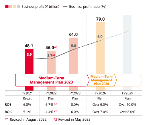 Medium-Term Management Plan 2023/2026 addresses issues encountered under the previous Medium-term Management Plan and changes in the external environment over a six-year time frame. Our goal under this plan is the optimization of our business portfolio from an ROIC perspective through KPI management and DX-based restructuring of existing businesses. By linking our business strategies to our aterialities, we aim to achieve growth and development for the NH Foods Group while contributing to the solution of social issues.