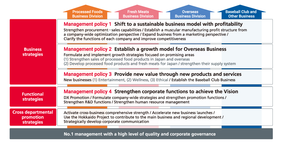 The NH Foods Group will continue to implement structural reforms while vigorously pursuing growth strategies, including the expansion of new areas within existing business domains, the expansion of overseas processing operations, and the creation of new businesses.