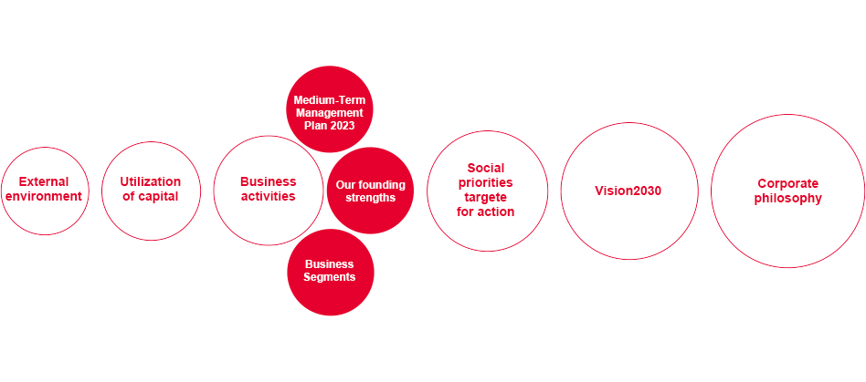 Under Medium-Term Management Plans 2023 and 2026, which we formulated by backcasting from Vision2030, we are currently pursuing three business strategies and one functional strategy. Presented here is detailed information about results and future plans under these strategies for each segment. The information also includes close-up analyses of our R&D activities, development and design processes, DX initiatives, and human resources, all of which are linked to value creation and growth.