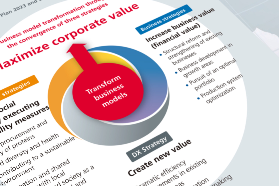 Described here is our roadmap for the realization of Vision2030, in which we define the future that we envision for the NH Foods Group in 2030. Here you will find information about the establishment of optimal production systems and pursuit of an optimal portfolio, our ROIC management policies, business risks and opportunities, progress toward the creation of social value through initiatives based on our Five Materialities, and IT and DX initiatives to support the creation of new value.