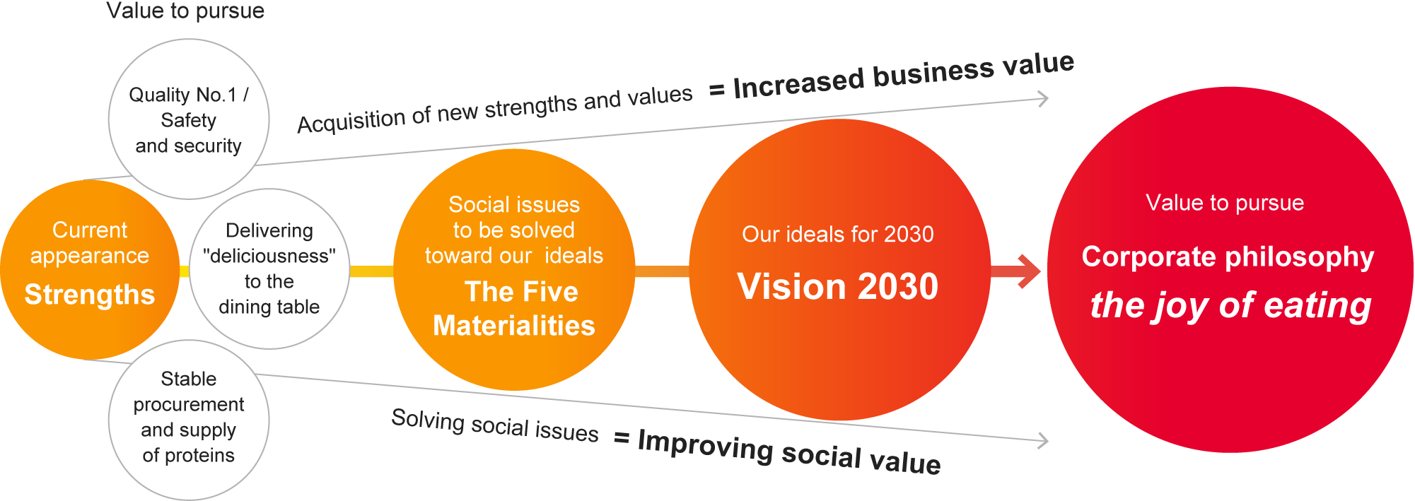 Our Vision2030 corporate ideal of “Unleash new potentials for protein” aims to maximize corporate value by using our business activities to solve the social issue of protein availability.
