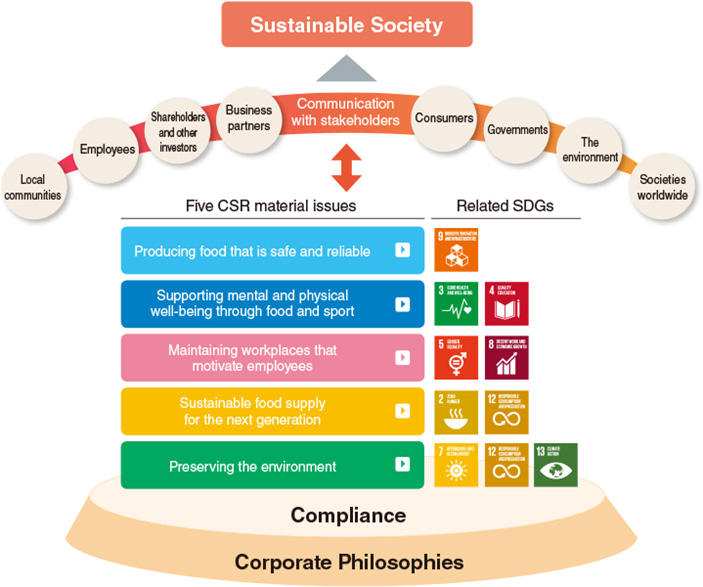 In January 2016, the NH Foods Group identified the Five CSR material issues as part of the strategic promotion of CSR. The selection process was based on both societal requests that incorporated international trends and initiatives as well as the prevailing business environment; at the same time, we evaluated and considered these issues from the perspective of our stakeholders and of the company itself. Going forward, we will continue to place importance on dialogue with various stakeholders and accelerate our efforts to address these issues.