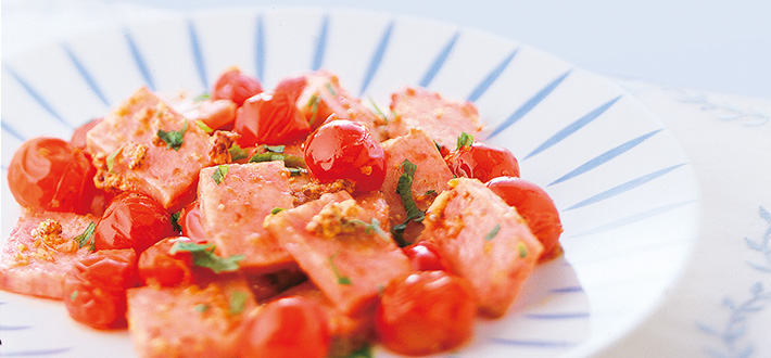 ミートローフとプチトマトの粒マスタード炒め