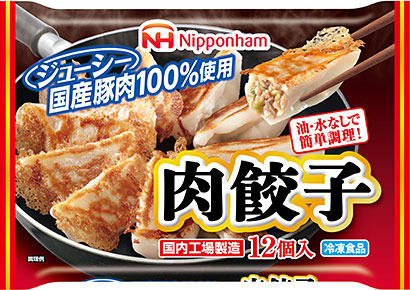 今回発売する「肉餃子」は、お肉の味を楽しめるよう、冷凍食品の餃子としては珍しい、お肉には国産チルド豚肉を100%使用しており、肉汁があふれるジューシーな仕上がりとなっています。また、皮生地には中華スープを練りこみ、モチモチした食感と旨みが特徴。タレなしでも美味しくお召し上がりいただけます。調理は、水なし、油なしのフライパン調理なので、誰でも簡単に美味しく焼ける餃子です。お肉のことを知る日本ハムだからこそ、お肉にこだわった「肉餃子」です。