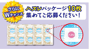 ハズレパッケージを10枚集めて、封筒に入れ、住所・氏名(フリガナ)・電話番号・性別・年齢を明記の上、郵送にてご応募ください。抽選で300名様に当社製品詰め合わせ(3,000円相当)をプレゼント。