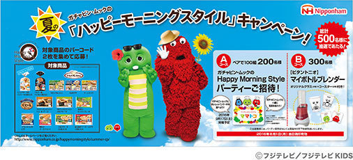 今回実施のクローズドキャンペーンは抽選で合計500名様にガチャピン・ムックと一緒に楽しめるHappy Morning Styleパーティーに参加できる招待状やガチャピン・ムックおすすめの朝食グッズをプレゼントいたします。
