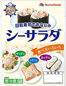回転寿司チェーンの軍艦ネタとしておなじみになったシーサラダをパンや野菜サラダ、おにぎりなど食卓への出現頻度が高いメニューにご活用いただくことで、メニューの広がりを楽しめます。主な原料のイカや貝は、部位ごとにその特性に合わせて別々に調味してから混ぜ合わせるこだわりで、具材のおいしさがしっかりと味わえます。