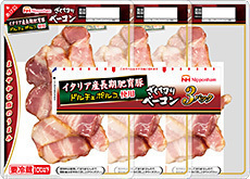 ベーコン市場は、使用用途が広く保存性も高いことから家庭での食卓出現率も高くなり今後も拡大傾向にあると予測されています。本商品は、原料に口どけの良い脂が特長のイタリア産長期肥育豚ドルチェポルコを使用しました。また、豚バラ肉を原形のまま吊るして加熱する吊るし製法のため、風味豊かなスモークの薫りが楽しめるベーコンです。そのままでも料理に入れても使いやすい一口サイズのざく切りにしているので、メニューの拡大が期待できる商品です。シングルタイプ、三連タイプの2種類です。