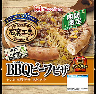 同時に、チルドピザ市場にない牛肉具材をトッピングした石窯工房®「BBQビーフピザ」も発売します。トマトペーストをベースに、果実酢・果汁で仕上げたスモーク香る自家製のバーベキューソースで味付けした牛肉を使用しました。彩りの良いコーンをトッピング。2017年9月末までの期間限定発売です。