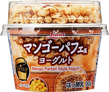 マンゴーパフェ風ヨーグルトは、マンゴーのフルーティーさと素材のサクサクとした食感が楽しめます。2種類のマンゴーを使用した酸味とコクが楽しめる果肉入りのヨーグルト。“素材”はグラノラ入りで食べごたえもあります。