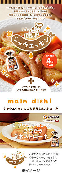 テーマは、「いつもの料理にプラス シャウエッセンス」。クックパッドのタイアップページでの展開の他、店頭PAPでの動画配信やPOPなどでのメニュー紹介も行います。