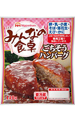 ごちそうハンバーグ 夕食向けのボリュームのあるハンバーグをつくりました。ソースが入っており、つなぎに米粉を使用することで肉感が出るようにしました。