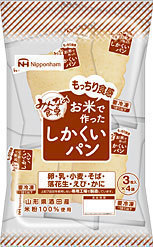 お米で作ったしかくいパン 食パンのように四角い形の米粉パンをつくりました。山形県酒田産100%の米粉を使用しています。酒田市の一部の給食で提供されている1食分(3枚)を1パックの小分けにして、食べきりサイズにしました。
