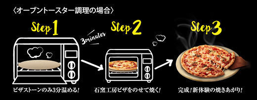 使用方法は、「ピザストーン」をオーブントースターにセットして予熱していただき、袋から取り出したピザを「ピザストーン」に乗せ、焼き上げます。
