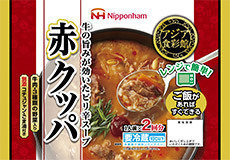 「赤クッパ」・・・韓国料理のユッケジャンクッパをモチーフにしました。ユッケジャンクッパとは牛肉・野菜・ご飯を香辛料の効いたスープで煮込んだ韓国風の雑炊のことです。本商品は、牛の旨みを効かせたピリ辛スープで牛肉と3種類の野菜を煮込みました。