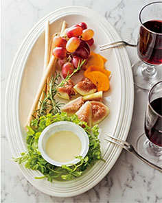 3.2のチーズフォンデュ、グリッシーニ、果物を盛り付け、ハーブを添える