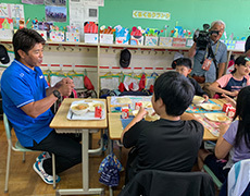 当日は同校の5~6年生を対象に、2つのプログラム「体を動かす授業」「食育授業」を行いました。北海道日本ハムファイターズのベースボールアカデミーコーチ・牧谷宇佐美氏と、特別講師スポーツ・コミュニティー・オフィサー(以下、SCO)・稲葉篤紀氏は「体を動かす授業」でバランスやチームワークの大切さを、弊社中央研究所の管理栄養士・八巻法子氏は「食育授業」でバランスよく食べる大切さを伝えました。また、3名の講師も子どもたちと一緒に同じメニュー(みそラーメンとカニ玉、牛乳)の給食を楽しみました。子どもたちからは「好き嫌いなくたくさん食べようと思う」「緊張していたけど楽しかった。これからも運動を頑張ります」といった感想がありました。最後に稲葉SCOから「朝食などの食事を抜くと体力・学力などにも差が出てくると言われているので、食べることの大事さを子どもたちに伝えていきたい」とコメントされました。