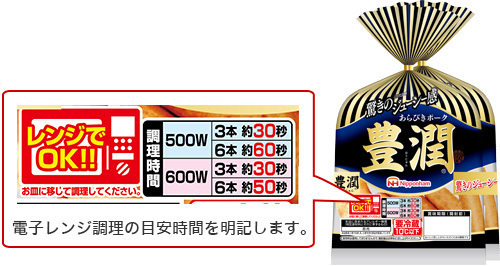 本商品の発売に合わせて、発売中の豊潤あらびきポークウインナーも電子レンジ調理対応商品へとリニューアルし、包材に電子レンジ調理の目安時間を明記します。