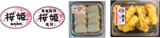 国産鶏肉 桜姫のシールやブランドロゴのついたお肉または惣菜商品。