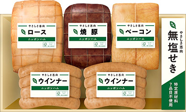 日本ハムは環境配慮や食品ロスの取り組みを推進しており、化粧箱の紙の使用量削減のほか、店頭の見本サンプルをリユース可能な素材に随時切り替えています。『やさしさ志向』は、無塩せき製法(※2)によりお肉本来の自然な色合いで、「特定原材料7品目」不使用。