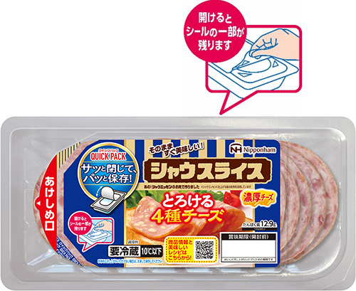 | 特徴 | ・厚さ約0.6mmの超薄切りのロースハムです。 ・サラダのトッピングやサンドイッチの具材に使うことで、ボリューム感のあるメニューに仕上がります。 ・開け閉めできて保存に便利なクイックパック形態です。 |