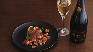 和牛A5ランクとアメリカ産牛肉プライムの食べ比べと、3者のプロがペアリングしたスパークリングワイン(商品一例)