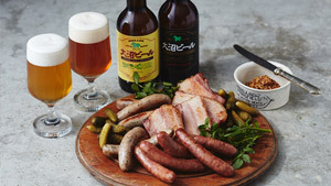 道南産の黒豚原料を使ってカール・レイモンで製造。地元で人気のクラフトビール大沼ビールやはこだてわいんを組み合わせて販売