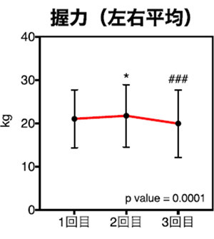 食事 + 運動介入後(2回目)、介入前(1回目)と比べ、握力(左右平均)の有意な増加がみられた。