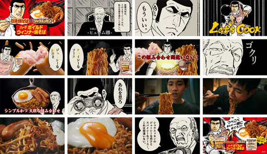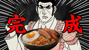 ヒューム卿のつべこべうるさいオーダーに対し、デューク東郷は「シャウエッセン」 と「日清焼そば」を一つのフライパンで一緒にゆでて作るシンプルかつ大胆な調理方法で、“ハードボイルドウインナー焼そば” をクールに仕上げていきます。