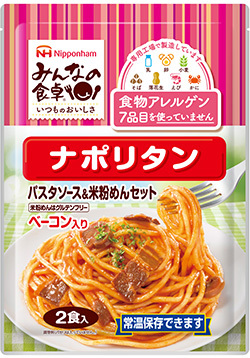 「みんなの食卓」シリーズは「おいしさに安心をそえて」というコンセプトのもと、アレルギー物質特定原材料7品目(卵・乳・小麦・そば・落花生・えび・かに)を使用せずに作っている食物アレルギー対応商品です。特定原材料7品目を使用しない食物アレルギー対応の専用工場で製造しています。使用する原材料についても、特定原材料7品目の混入がないか確認検査を行っています。パスタのほかハムやベーコン、ハンバーグ、ミートボール、米粉パン等を取り揃えています。