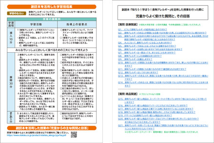 副読本を活用いただいた先生からの要望を受け、昨年プロジェクトAが実施した「オンライン出前授業」で寄せられた質問を踏まえ「児童からの主な質問と回答」を今年新たに作成しました。先生方が、副読本を授業で活用される際に役立てていただくことを想定して作成したもので、「大人になって食物アレルギーになることはありますか?」「食物アレルギー配慮商品はパッケージにどのような工夫をしていますか?」などの質問事項と回答例を掲載。副読本と合わせて配布している指導解説書に閲覧方法を紹介しており、先生方にWEB上でご覧いただけます。