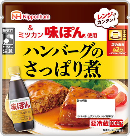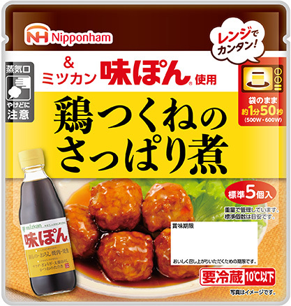 ミツカンの味ぽんは1964年の発売以来、さっぱりとした味わいが根強い人気を博している、認知度97.5%※のロングセラー商品です。お肉との相性ピッタリな味ぽんをベースにしたたれで「鶏つくね」と「ハンバーグ」をさっぱりとした味付けに仕上げました。 電子レンジで袋のまま調理でき、おかず1品を簡単につくることができます。