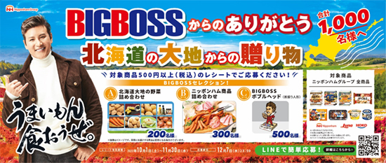 ニッポンハムグループの対象商品500円以上お買い上げのレシートを対象に、BIGBOSSおすすめの北海道大地の野菜詰め合わせのセットのほか、ニッポンハム商品の詰め合わせなどを抽選で合計1,000名様にプレゼントします。