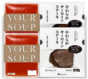 今歳暮では、オマール海老のビスクとのセット商品「やわらかサーロインステーキとスープセット」を発売します。