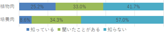 認知(知っている、聞いたことがある)は、植物肉が6割弱&培養肉が4割強