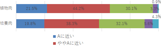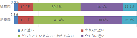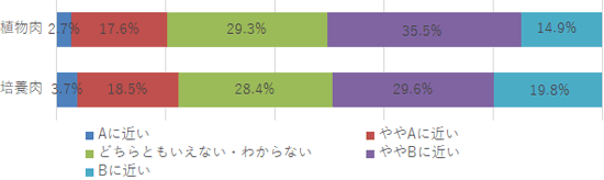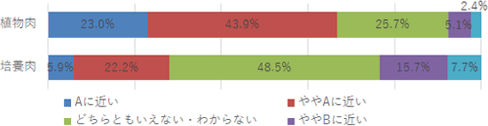 Q.植物肉/培養肉について、通常の肉と比べてどのようなイメージがありますか。それぞれに最も当てはまるものを選択してください。 A:美味しい B:美味しくない