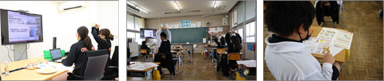 児童に向けて、資料を画面に表示しながら説明する講師(広島)【写真左】/児童がジェスチャーでクイズに回答する様子や、表示を見るワークに取り組む様子(香川)【写真中央・右】