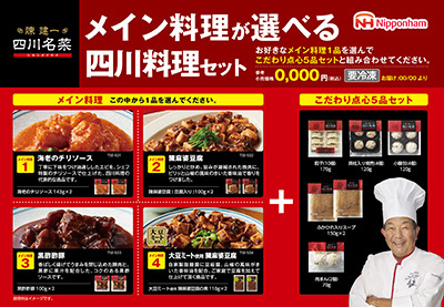 人気の四川名菜から選べる楽しさを提供する四川名菜セレクトを発売します。メイン料理(海老のチリソース・陳麻婆豆腐 ・黒酢酢豚・大豆ミート使用 陳麻婆豆腐の素)の中から1品選んでいただけるギフトセットです。